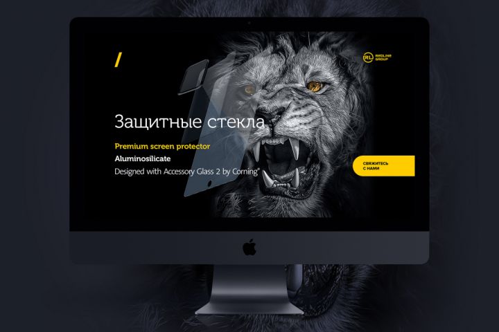 Веб-страница для премиальной защитной пленки с эффектным изображением рычащего льва.