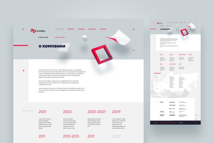 Страница "О компании" для веб-сайта AP Consulting, с информацией об истории компании и графическими элементами.