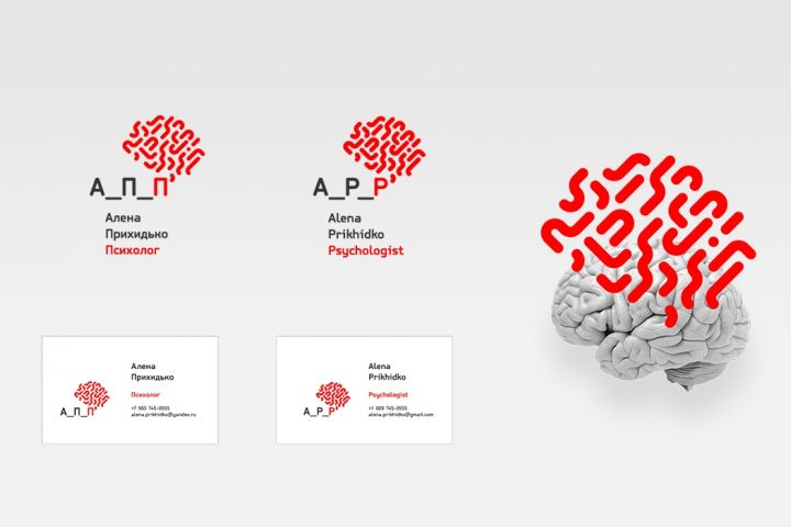 Дизайн логотипа и визитных карточек для психолога с использованием графического изображения мозга.