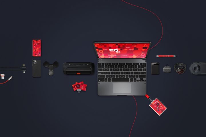 Дизайн фирменных аксессуаров и гаджетов, выполненный в черно-красной цветовой гамме.