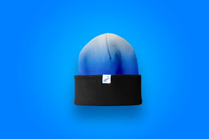 Дизайн фирменной шапки с логотипом компании, выполненной в синем и черном цветах.