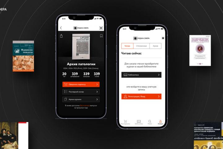 Приложение издательства "Медиа Сфера" для доступа к медицинским журналам, включая функции управления подписками и чтения последних выпусков.