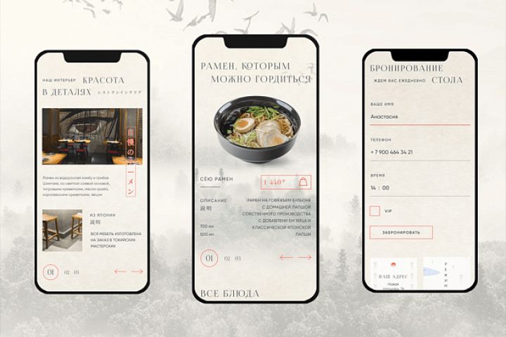 Стильное мобильное приложение для рамен-ресторана, предлагающее детальную информацию о блюдах, опции бронирования и особенности интерьера ресторана.