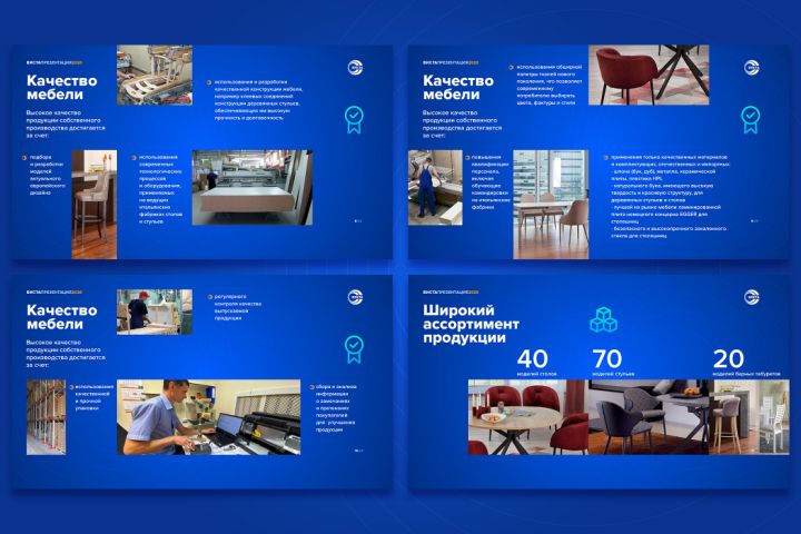 Презентация для выставки мебели. Использованы синие тона и фотографии производственного процесса.