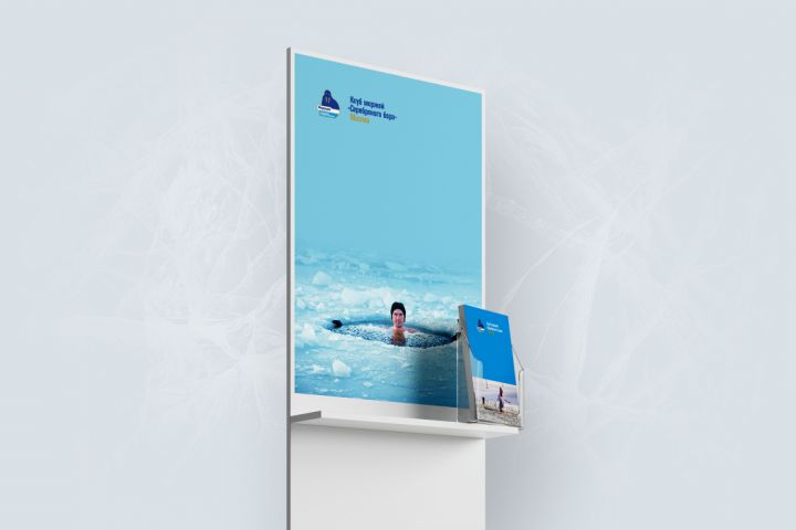Дизайн постера и брошюры для клуба моржей. Синий цвет и изображения зимнего купания создают холодную атмосферу.