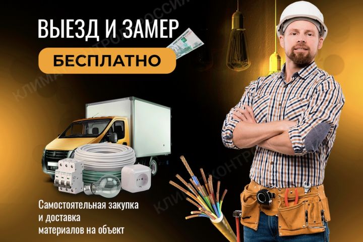 Реклама, продвигающая бесплатный выезд и замер для электромонтажных работ, включая самостоятельную закупку и доставку материалов на объект.
