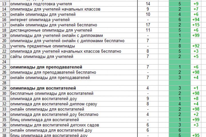 Анализ позиций сайта solncesvet.ru в поисковой системе Яндекс по ключевым запросам, связанным с курсами повышения квалификации и олимпиадами для учителей. Сравнение данных за две даты показывает значительное улучшение позиций.