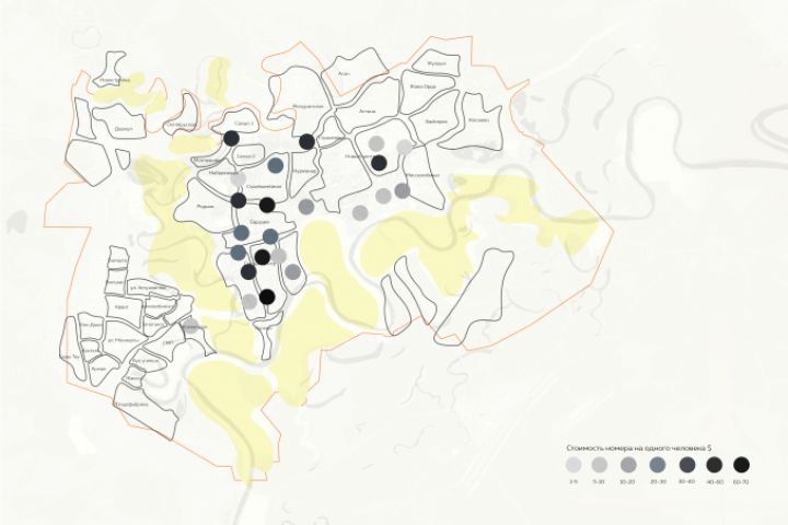 Карта города Уральск. Сведения стоимости номеров гостиниц по разным районам.