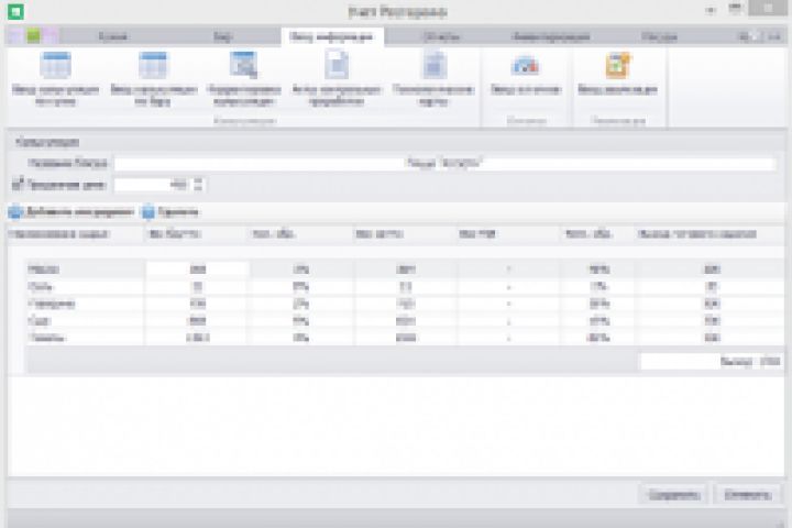 - ввод и изменение калькуляций по блюдам