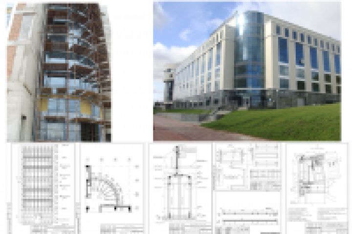 Проект структурного остекления радиусного витража с пересекающей его конструкцией входного тамбура и декоративным ярусом из композитного материала.