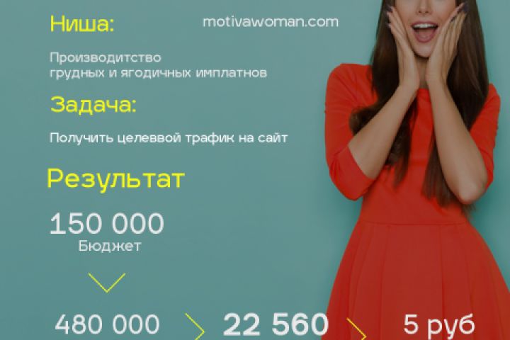Цель: Получить целевой трафик на сайт Бюджет : 150 000 рублей/месяц Результат: 1). 480 000 показов 2). 22 560 переходов 3). 5 руб/клик
