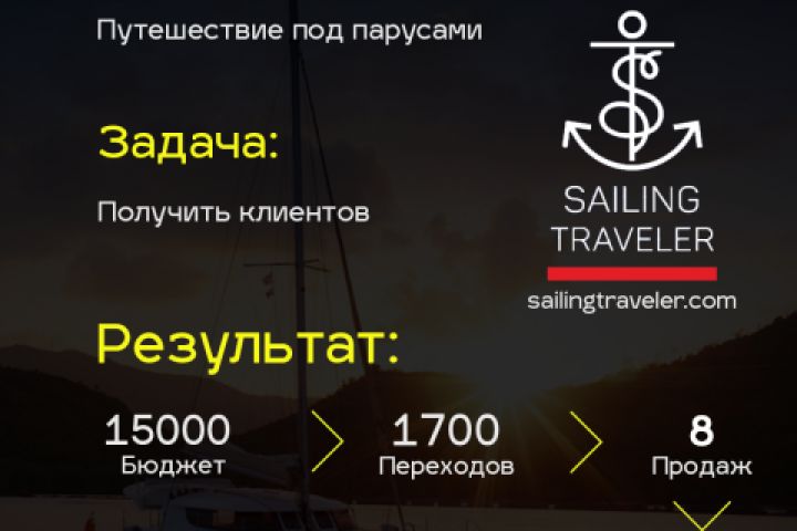 Ниша: Путешествие под парусами Цель: Получить новых клиентов Бюджет: 15 000 рублей Результат: 1). 1700 переходов 2). 8 продаж Выручка: 1 680 000 рублей