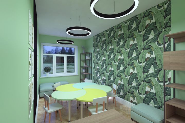Концепция кабинета экологии в спецшколе. Заказчик предоставил подборку мебели и оборудования, план помещения, пожелания к оформлению стен.