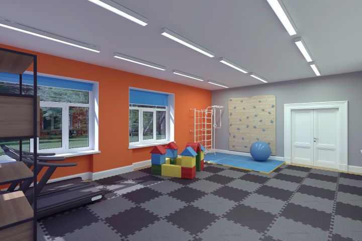 Концепция кабинета для спортивных занятий в спецшколе. Заказчик предоставил подборку мебели и оборудования, план помещения, пожелания к оформлению стен.