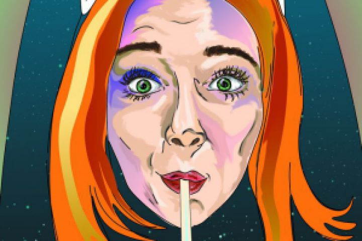 Персонаж в жанре "коммикс" с футуристичным освещением, атрибутами социальной роли (артефакты в руках, эллементы одежды).