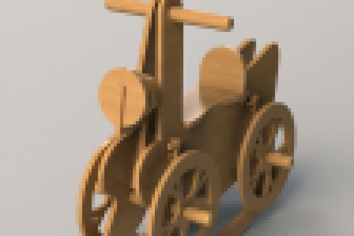 Велосипед предназначен для детей в возрасте 1-5 лет. Он сделан полностью из фанеры. Толщина фанеры 2 см . Составные части игрушки вырезаны из фанеры 170 × 170 см. Велосипед легко собирать и разбирать.