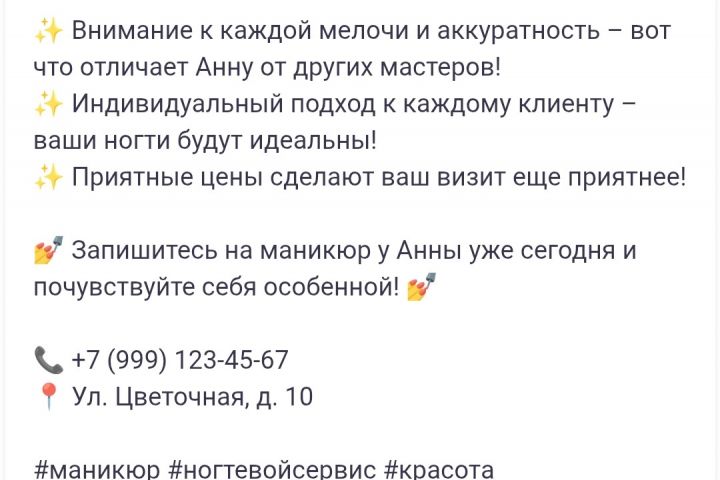 Нужно было написать продающий текст для социальных сетей мастер ногтевого сервиса Анна Смирнова.Ее преимущества:внимательная и аккуратная,приятные цены, индивидуальный подход. Опыт работы более 2-х лет.Размер текста - 500 символов.