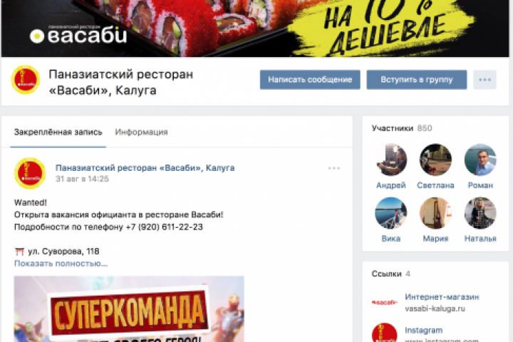 Продвижение ресторана паназиатской кухни "Васаби" в 3 социальных сетях: ВК, ФБ, Инстаграм.