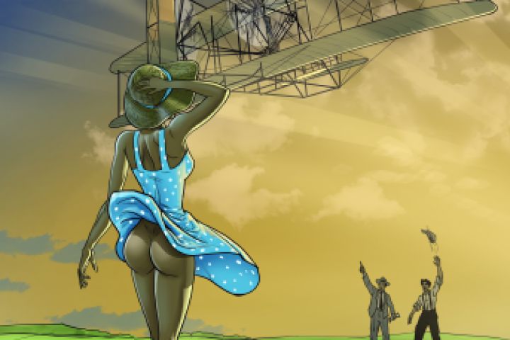девушка смотрит на взлетающий самолет братьев Ррайт
