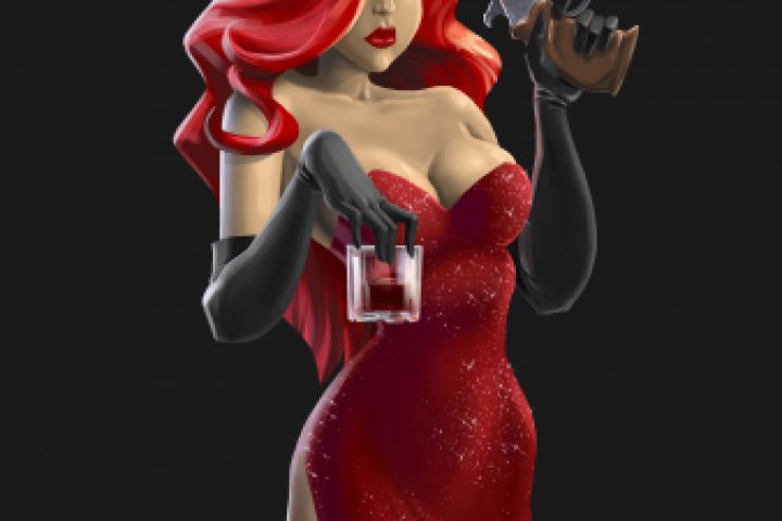 женщина в красном, большая грудь, в руке пистолет, рыжие волосы, красное платье