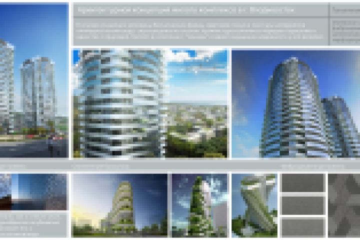 Стояла задача создания привлекательного фасада для двух жилых высоток. Из материалов использованы перфорированные металлические панели и фиброцементные панели. По всему фасаду задается динамика за счет формы балконов и плавного перехода материалов.