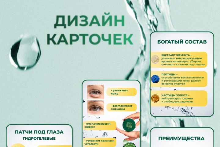 Я собрал данные о различных типах патчей для глаз, сформулировал основные идеи. Объединил все элементы в одну инфографику, обеспечив её информативность и привлекательность. Получившаяся инфографика помогает пользователям быстро понять преимущества и особенности разных патчей для глаз.
