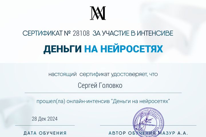Сертификат № 28108 за участие в интенсиве Деньги на нейросетях.