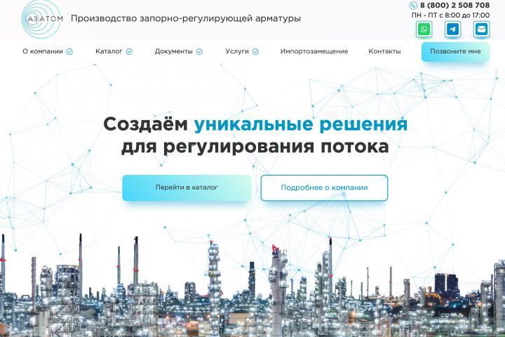 Сайт создан для компании АЗ АТОМ, специализирующейся на производстве и продаже запорно-регулирующей арматуры, регуляторов давления и другой промышленной автоматики. Платформа представляет продукцию, услуги и достижения компании, ориентированную на потребности крупных предприятий.