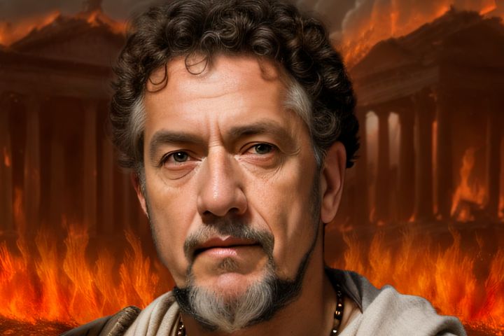 ТЗ: C помощью нейросети создать обложку для YouTube с Марком Аврелием на фоне горячего Рима (пожар)