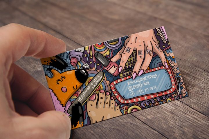 Визитка исполнена в стиле дудл арт, учтены все предпочтения заказчика, в такую визитку хочется долго вглядываться и не выпускать из рук.