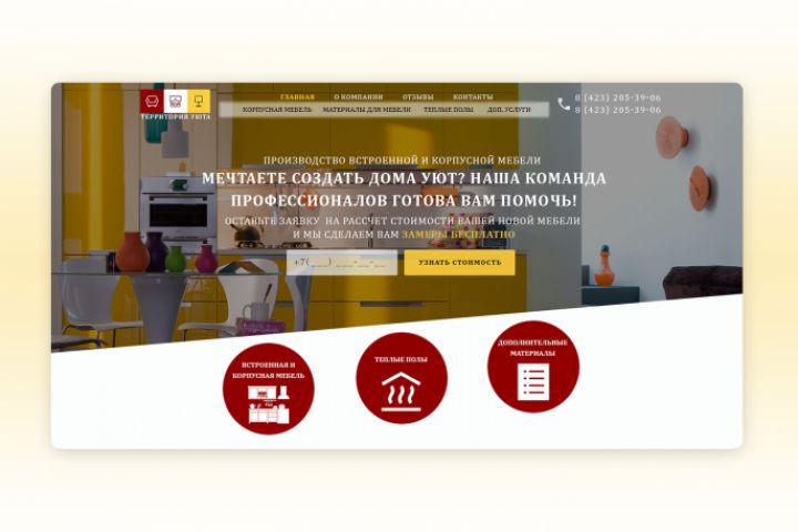 Задача: Разработать интерфейс и дизайн для сайта мебельной компании с собственным производством "Территория Уюта". При создании сайта использовались корпоративные цвета и удобный интерфейс для ознакомления с продукцией и для обратной связи.