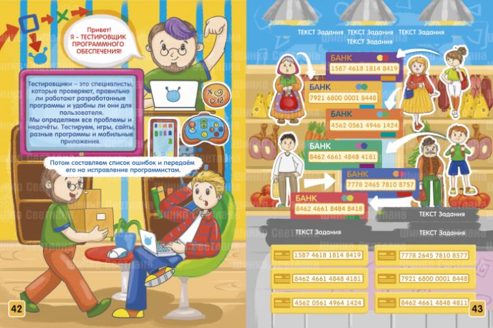Страница книги с детскими развивающими заданиями. Книга рассказывает детям о новых, современных профессиях таких как: ТЕСТИРОВЩИК, ПРОГРАММИСТ,