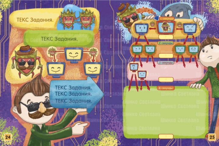 Страница книги с детскими развивающими заданиями. Книга рассказывает детям о новых, современных профессиях таких как: ТЕСТИРОВЩИК, ПРОГРАММИСТ,