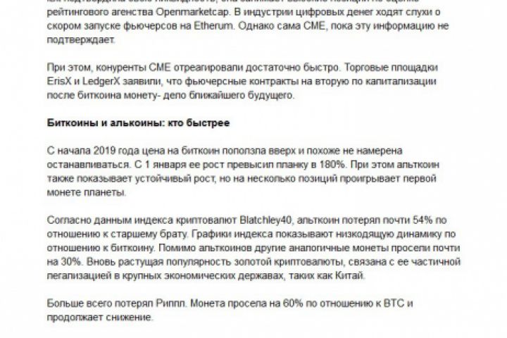 IBit подтвердила свою ликвидность, она занимает высокие позиции по оценке рейтингового агенства Openmarketcap. В индустрии цифровых денег ходят слухи о скором запуске фьючерсов на Etherum. Однако сама СМЕ, пока эту информацию не подтверждает.