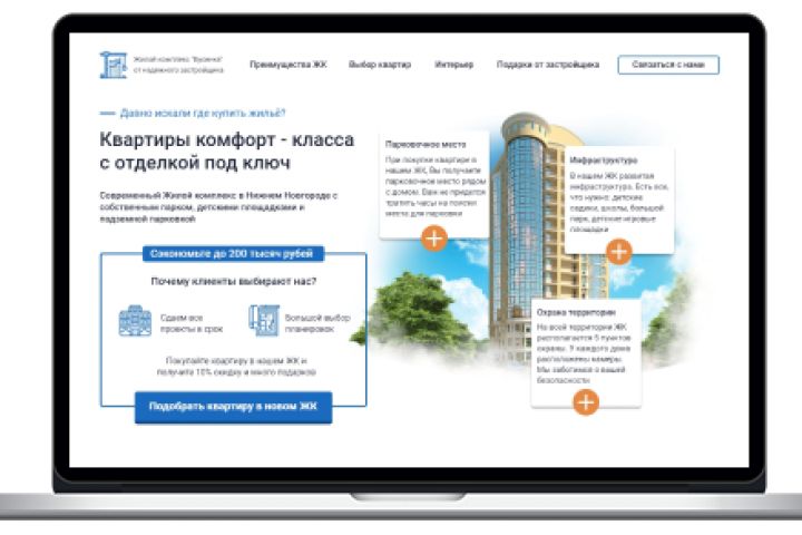 Была поставлена задача подробно описать преимущества ЖК, сделать упор на визуальный контент и информативность.