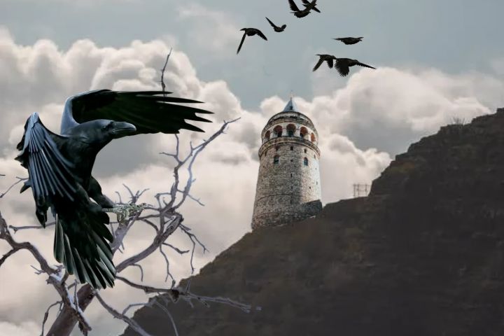 Коллаж, собран в Фигме из кусочков, найденных в интернете. Ворона, стая ворон, башня, обрыв, ветка - отдельные фрагменты.