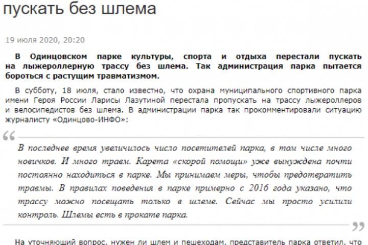Статья «На лыжероллерную трассу перестали пускать без шлема» для новостного портала «Одинцово-инфо».
