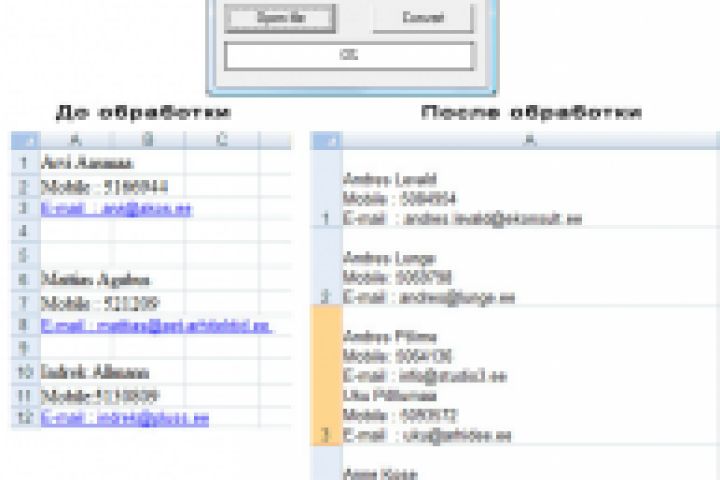 Обрабатывает файлы Excel, перенося данные, записанные на первом листе в один столбец построчно в группы, на второй лист с группировкой и в алфавитном порядке. Пример обработки данных показан на рисунке.