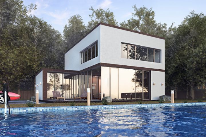 Визуализация загородного дома с бассейном в стиле хай тек