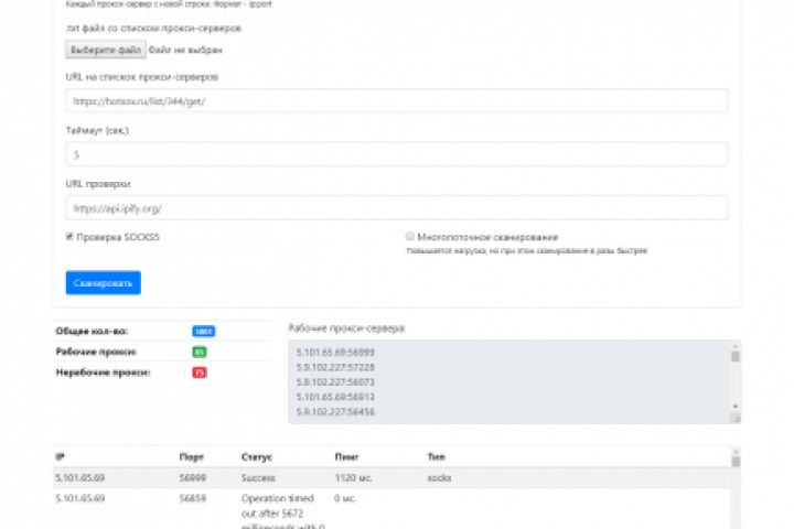 В результате после проверки формируется список из рабочих прокси-серверов, ведется статистика, показывающая кол-во рабочих и нерабочих прокси.