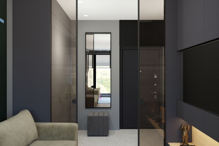 Входная дверь визуально поднята до потолка темными панелями, так как остальные двери высотой до потолка или скрытые.