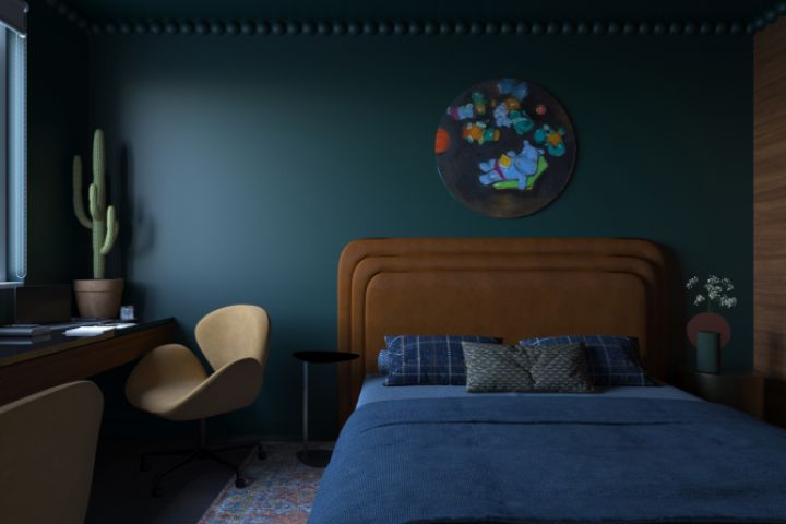 Спальня в двухкомнатной квартире. За основу концепции взяты цвета и пластика картины, колористическая схема с, сз, сф, + о, ко, жо отдельно подобран подходящий интерьеру текстиль в нескольких вариантах.