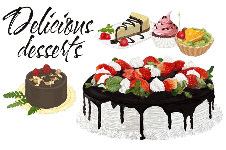 Десерты (акварель) нарисован на планшете, в программе фотошоп. Исходник большого разрешения и размера, все разложенно по слоям. Файл можно редактировать