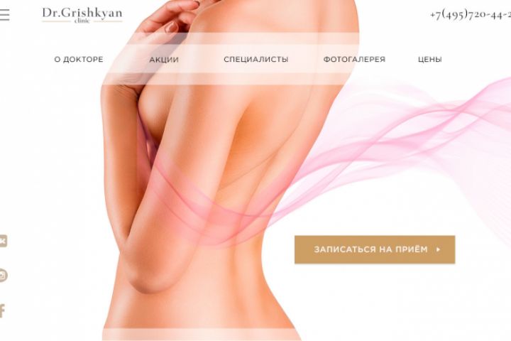 Лаконичный дизайн для целевой аудитории: женщины 25-30 лет, интересующиеся услугами пластических хирургов и косметологов. Цветовая гамма: белый + розовый + благородный бежевый.