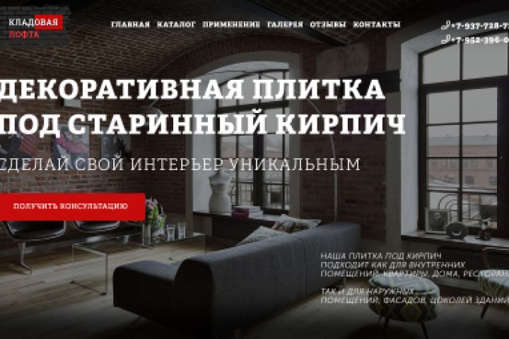 сайт по продаже декоративной плитки под старинный кирпич. Очень стильный дизайн в тёмных тонах, сделан на wordpress. Без шаблонов.