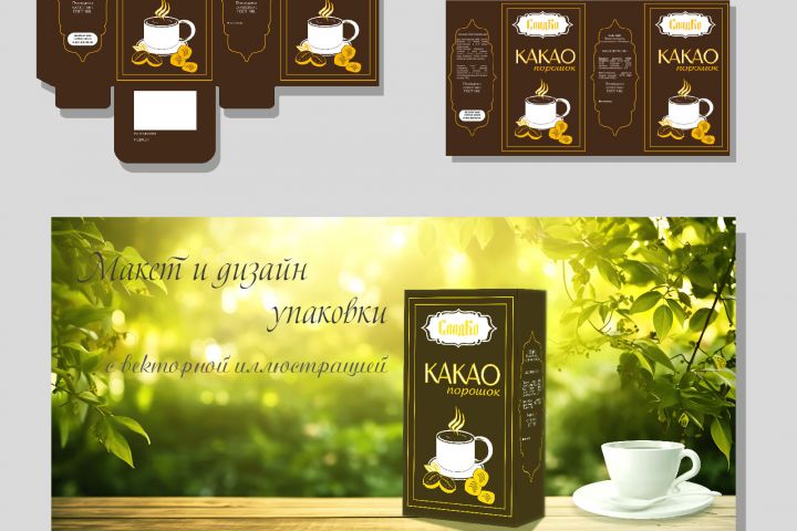Макет и дизайн упаковки продукции. Для коробки нарисована векторная иллюстрация. Дизайн выполнен в традиционном для такого продукта стиле, что вызывает у покупателя ощущение доверия к бренду и товару.