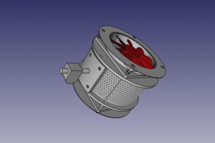 Проект уловителя дыма "smoke extractor". Имеет крепление для самостоятельного навесного монтажа и установки на стойку. Два пропеллера с разным углом атаки крыльчатки создают разницу в давлении, необходимую для достижения достаточного кол-во времени взаимодействия прогоняемого воздуха и гранул угля.