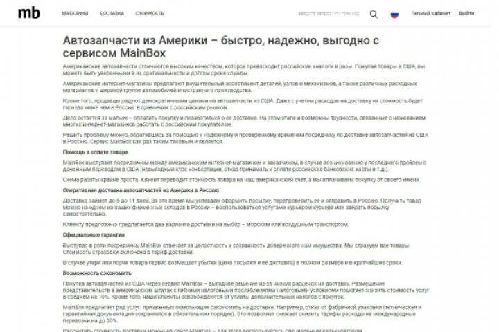 Текстовое наполнение сайта компании MAINBOX – доставка автозапчастей из США