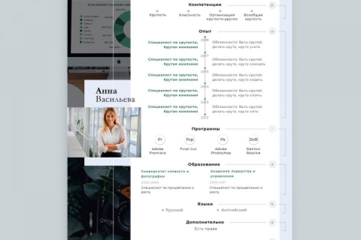 Индивидуальный дизайн резюме для специалиста в сфере фото и видео продакшн. Сделан акцент на руководительские компетенции кандидата.