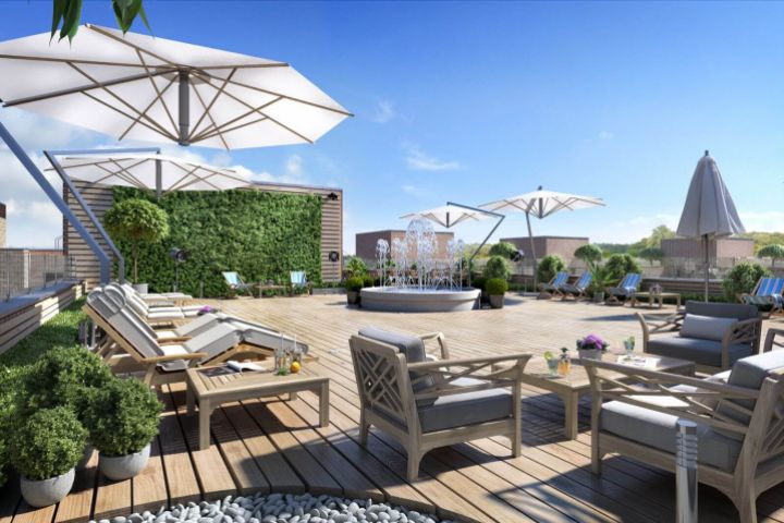 Создание визуализаций с использованием новых технологий рендера в дневное и ночное время суток. Готовые изображения показывают вид на жилой комплекс с набережной канала им. Москвы и благоустройство террас для отдыха на крыше здания.